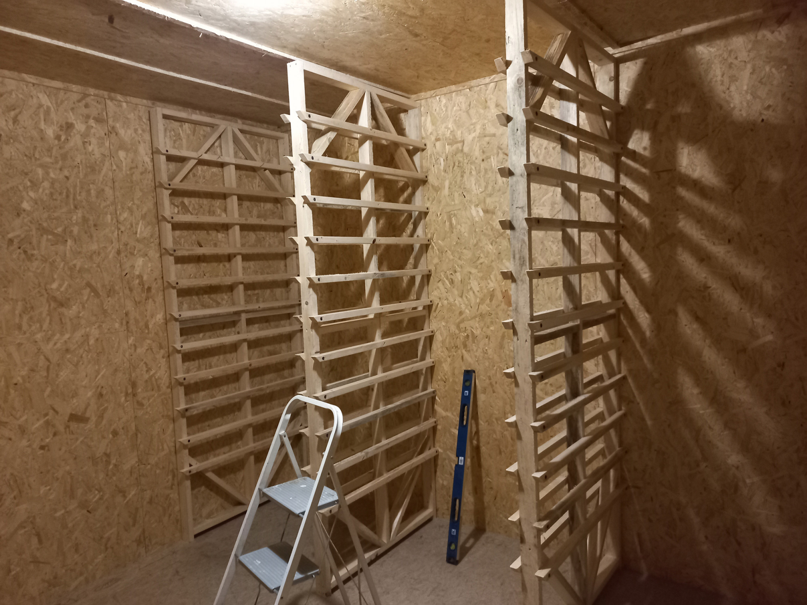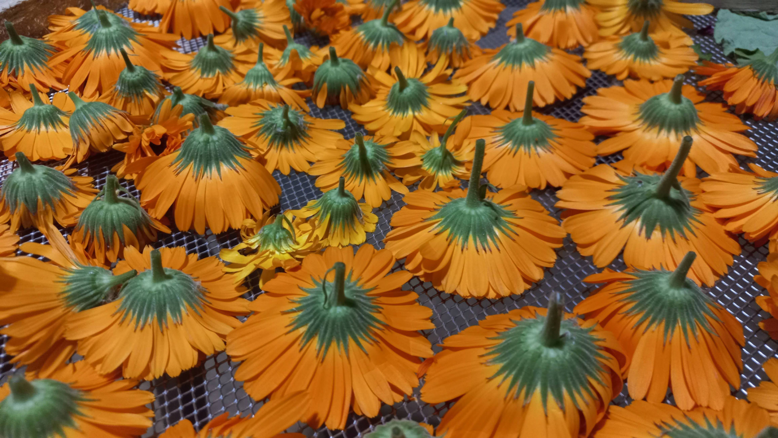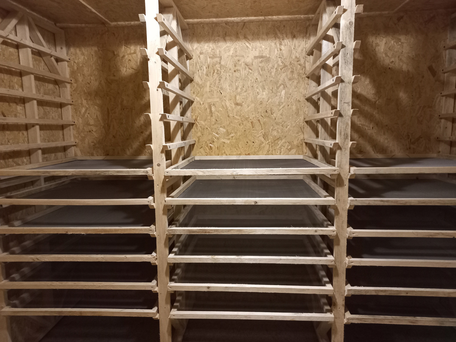 Il existe de nombreux types de séchoirs, du plus rustique jusqu'aux gros séchoirs industriels. Au jardin de la petite pervenche, j'ai opté pour un séchoir traditionnel dit "à claies", construit à l'hiver 2023-2024. Ce local dédié me permet de sécher les plantes dans l’obscurité, à une température ne dépassant les 38°C (dans l’idéal entre 28 et 33°C), avec une bonne ventilation et un déshumidificateur permettant d’extraire l’humidité de la pièce. Les plantes sont étalées sur des claies, c'est-à-dire des cadres de bois maintenant un fin grillage en inox alimentaire et disposés en étagères à une distance permettant de laisser passer l’air. Les plantes sont disposées sur les claies en couches d'épaisseur variable en fonction de leur degré d’humidité et de sensibilité à l’oxydation. Ainsi, les couches sont plus fines pour les plantes chargées en eau telles que la menthe et l’ortie, ou très sensibles tel que le romarin.