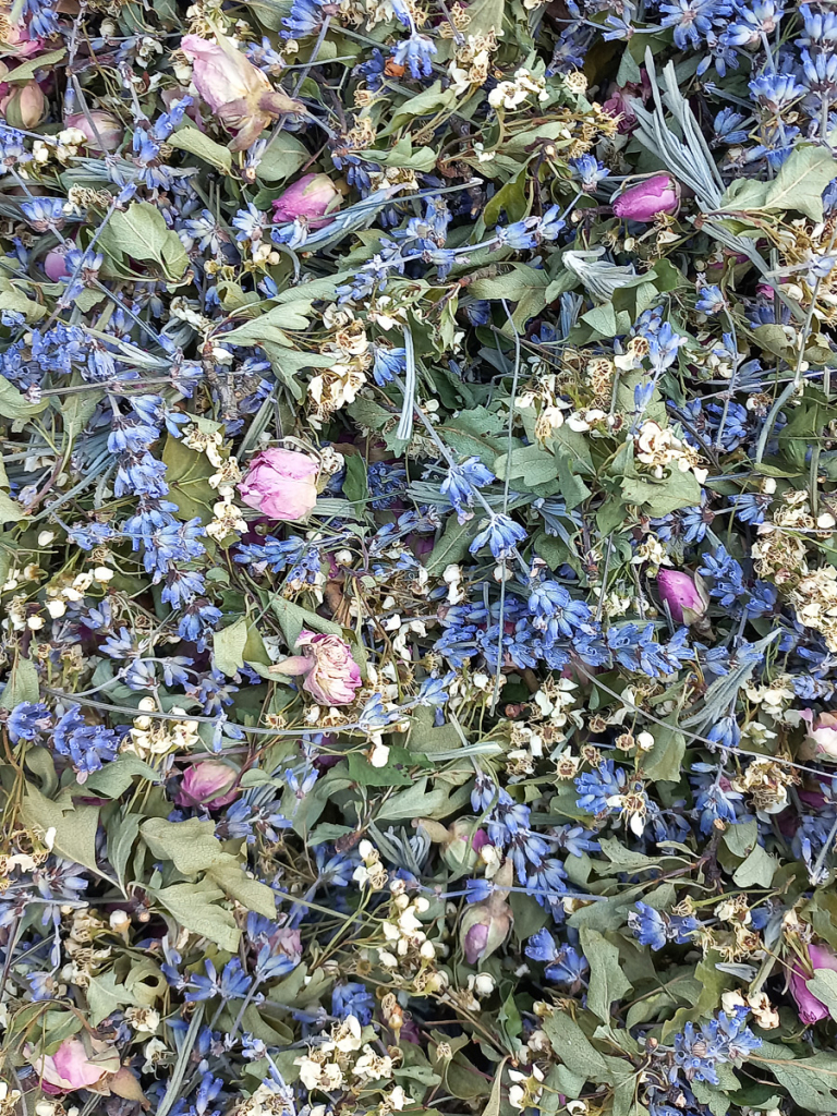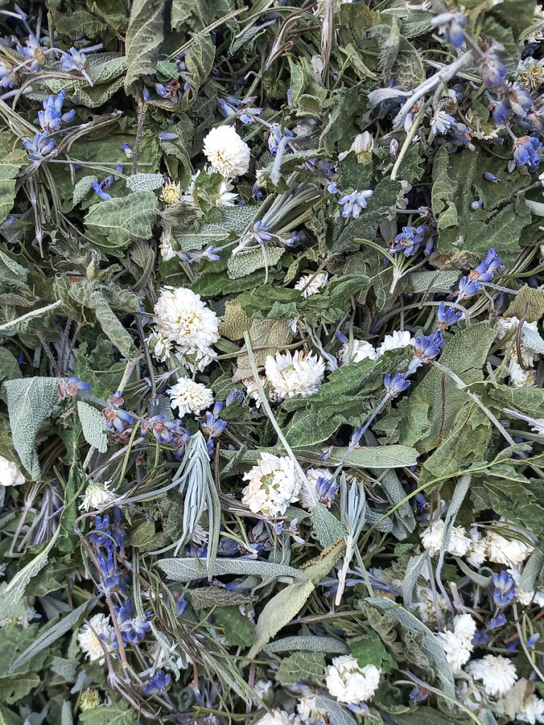 Sauge officinale, capitules de camomille romaine, romarin, ortie, fleurs de lavande.