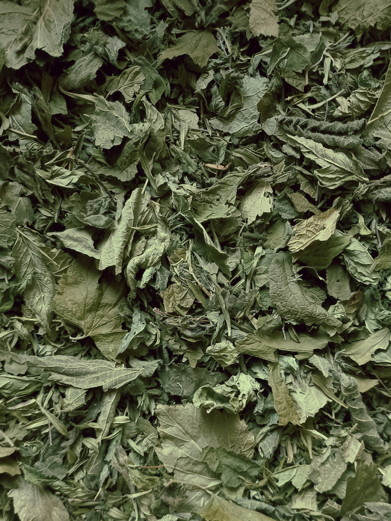 Sarriette, thym, ortie, feuilles de cassis, menthe verte.