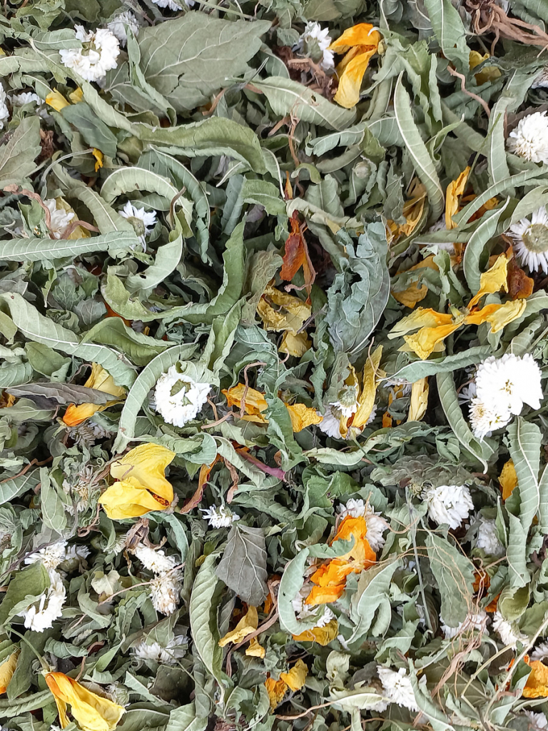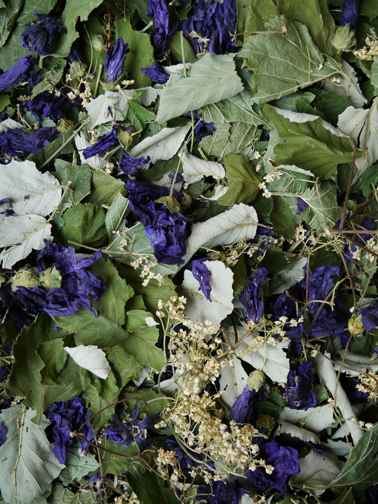 Thym citron, sarriette, feuilles de ronce et de cassis, fleurs de mauve et de sureau.