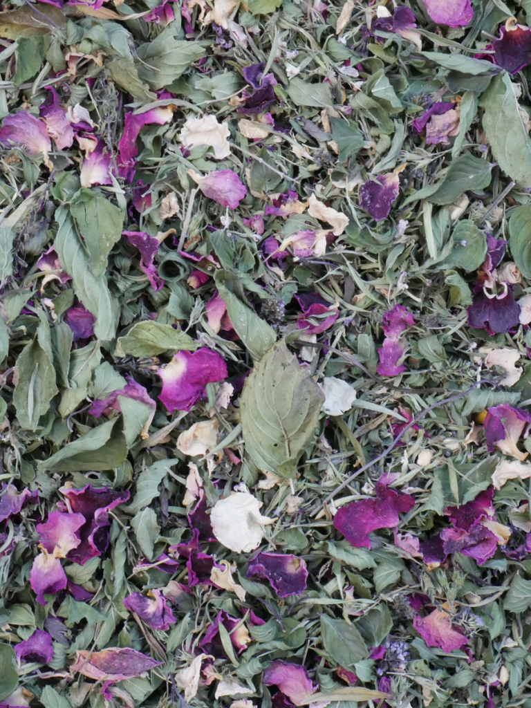 Sarriette, menthe poivrée, racines de gingembre, pétales de rose.